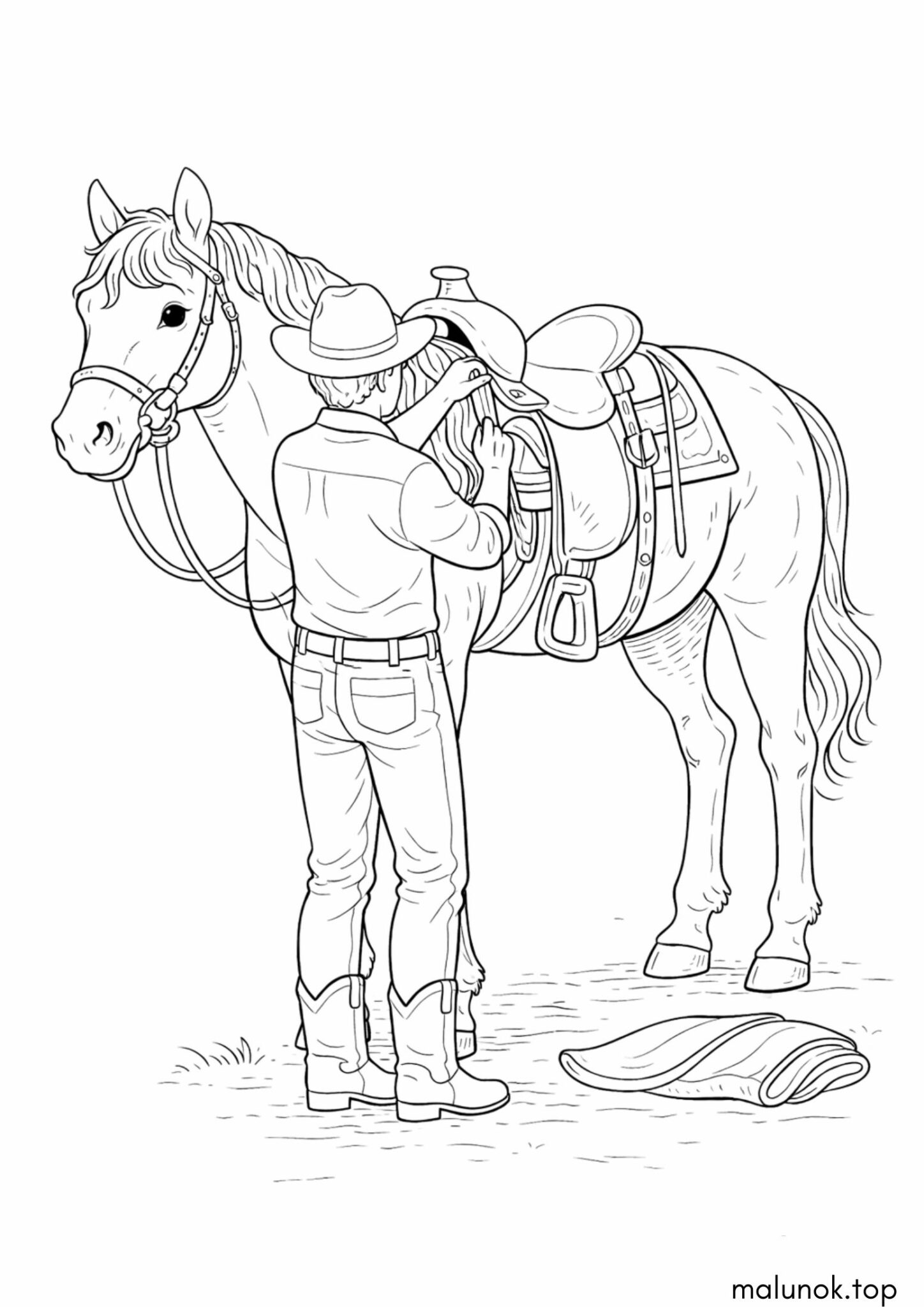 Розмальовка Коня запрягають у сідло